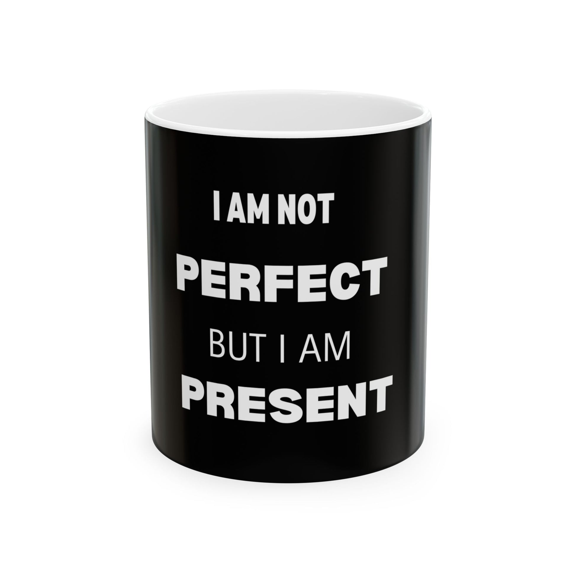 Black Inspirational Ceramic Mug - I Am Not Perfect But I Am Present, Motivational Coffee Cup, Gift for Self-Care, Mental Health Awareness