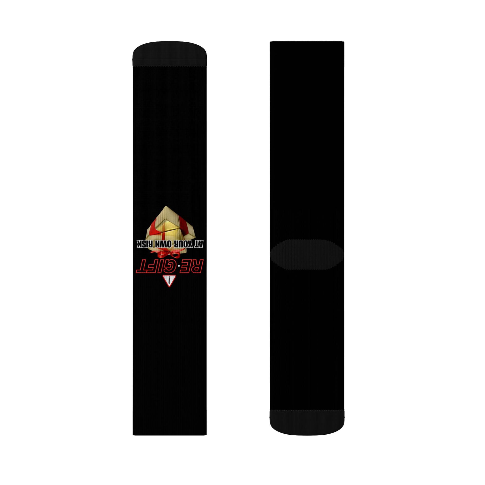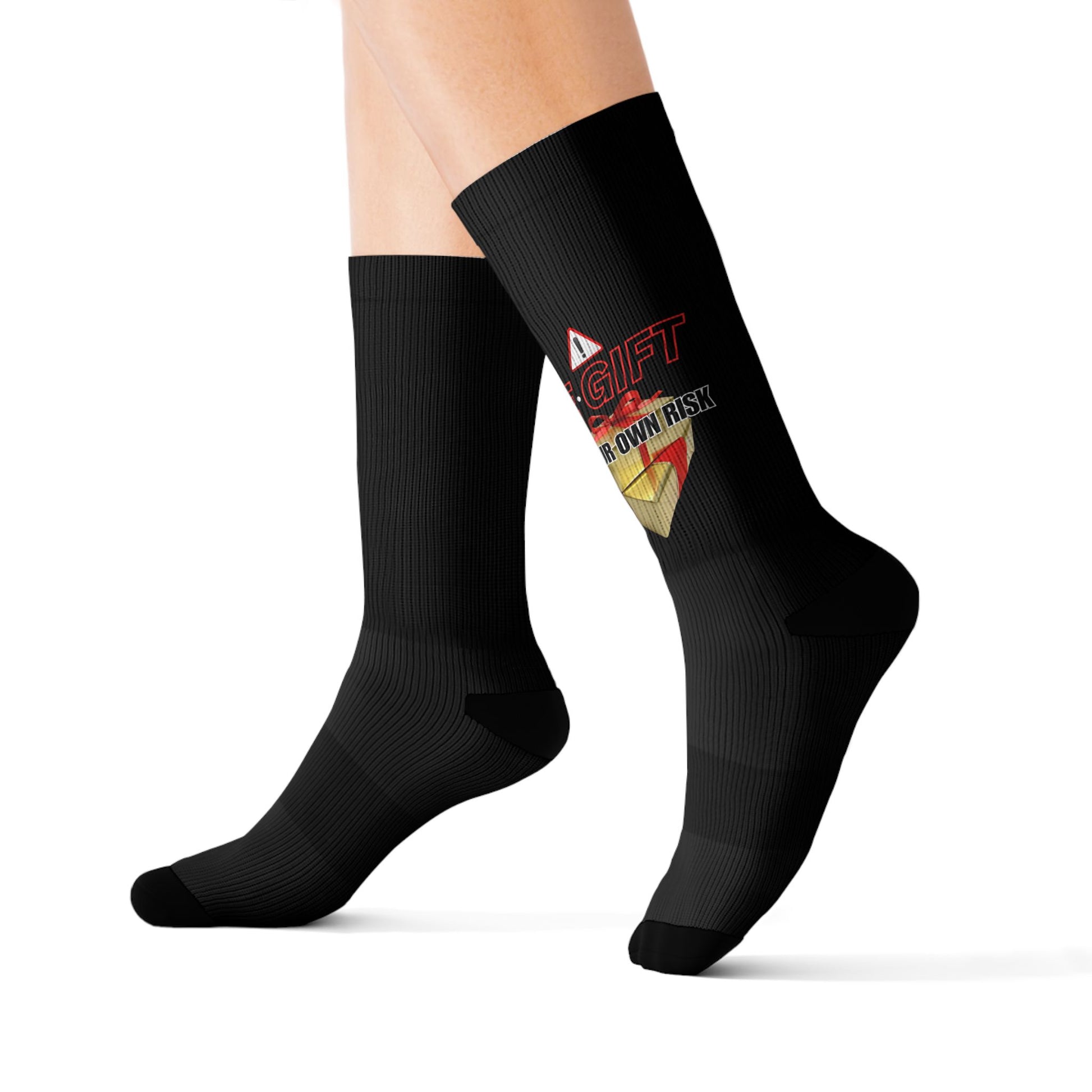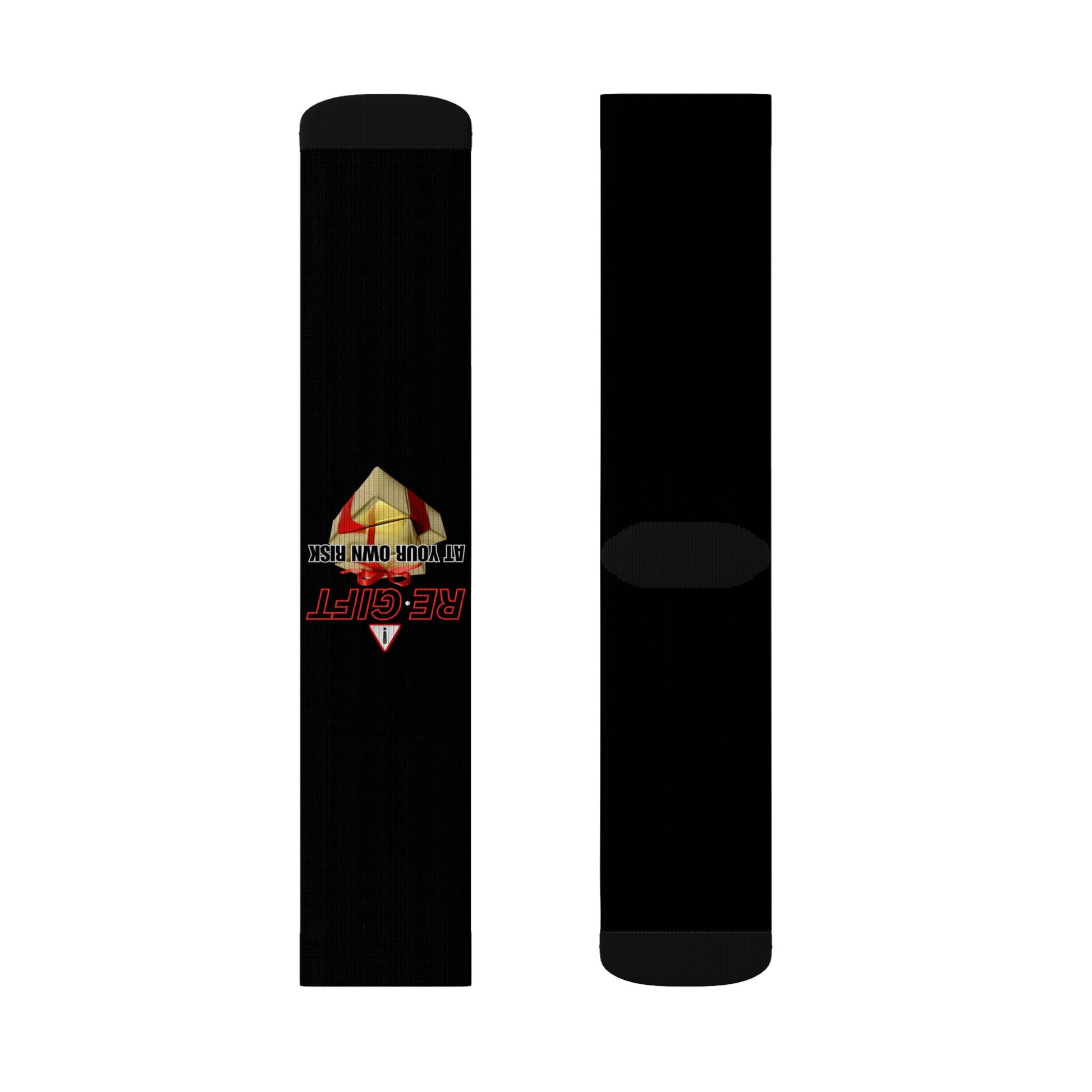 Christmas-themed socks with super soft fleece lining, all-over print, and cushioned bottoms. Perfect for keeping your feet warm and cozy during the holiday season. Ideal for anyone looking to add a festive touch to their outfit or give as a holiday gift.