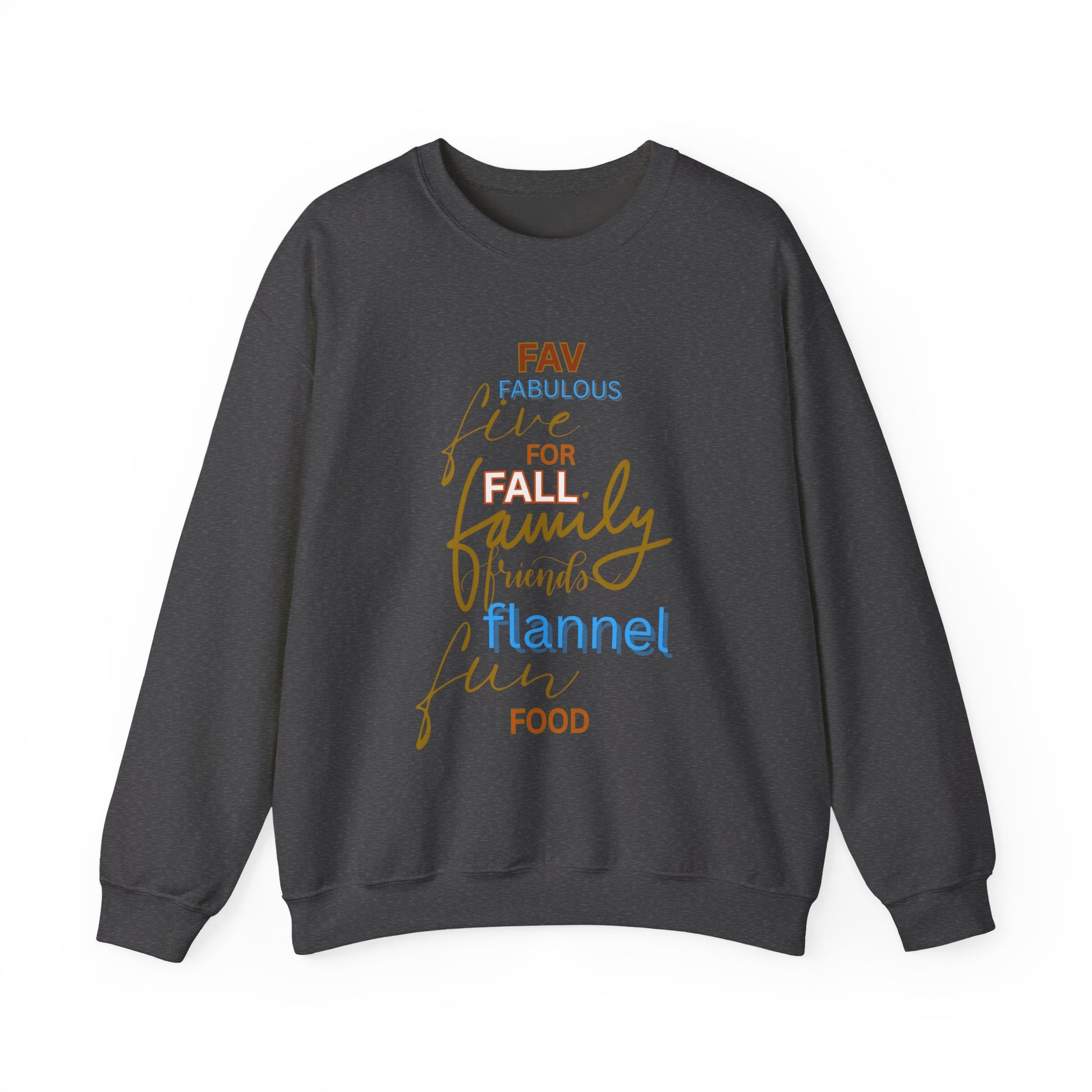 This cozy crewneck brings quiet fall evenings to life. Soft, medium-weight fleece holds warmth without bulk, while the warm-tone lettering and playful script list off favorite autumn things—family, flannel, food—so the sweater feels like a slow cider-sipping evening wrapped in fabric. The clean white base keeps the look fresh and easy to layer. Durable double-needle stitching and a tear-away label make it comfortable enough to reach for again and again. Wear it for casual weekends, low-key family gatherings, or strolls through crunchy leaves when you want something familiar and friendly to wrap up in.
