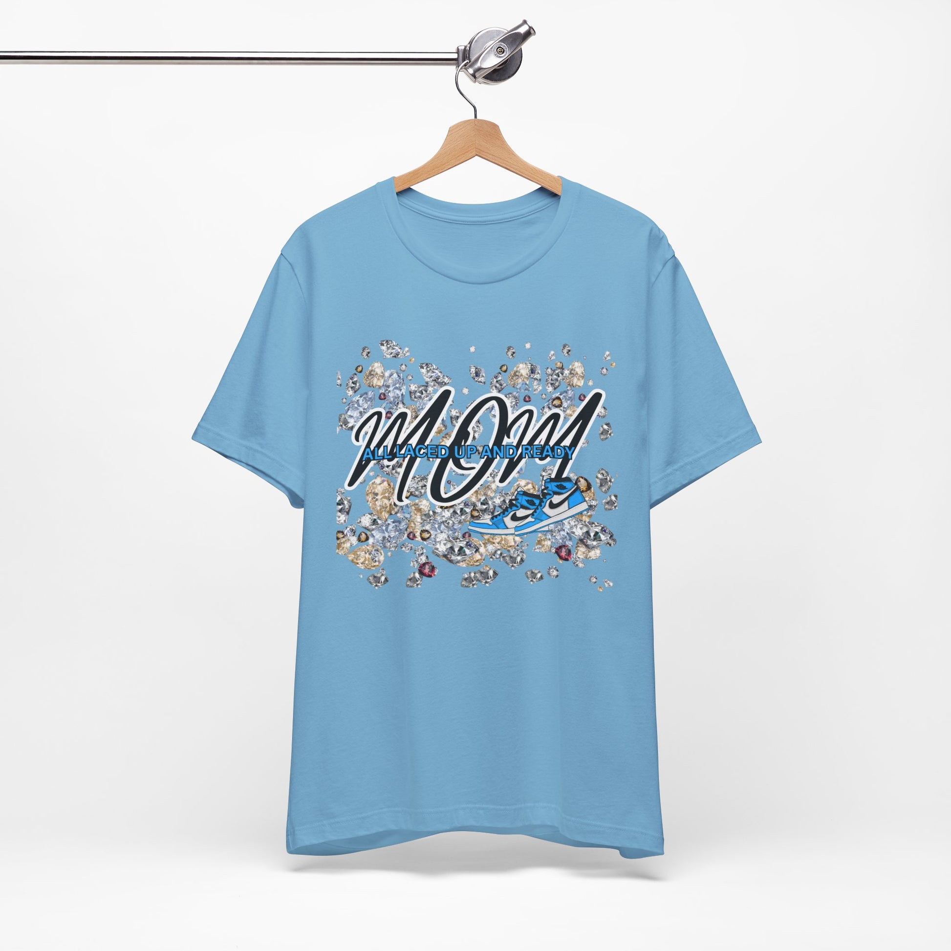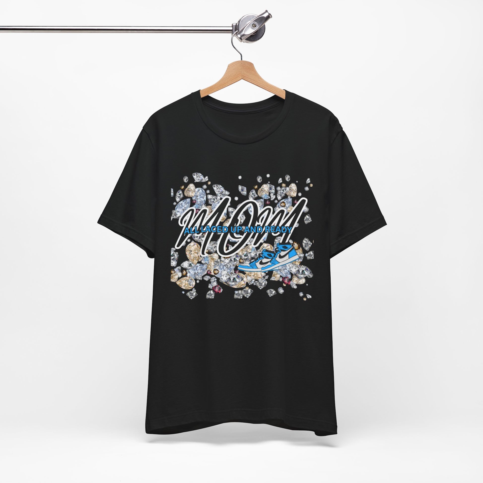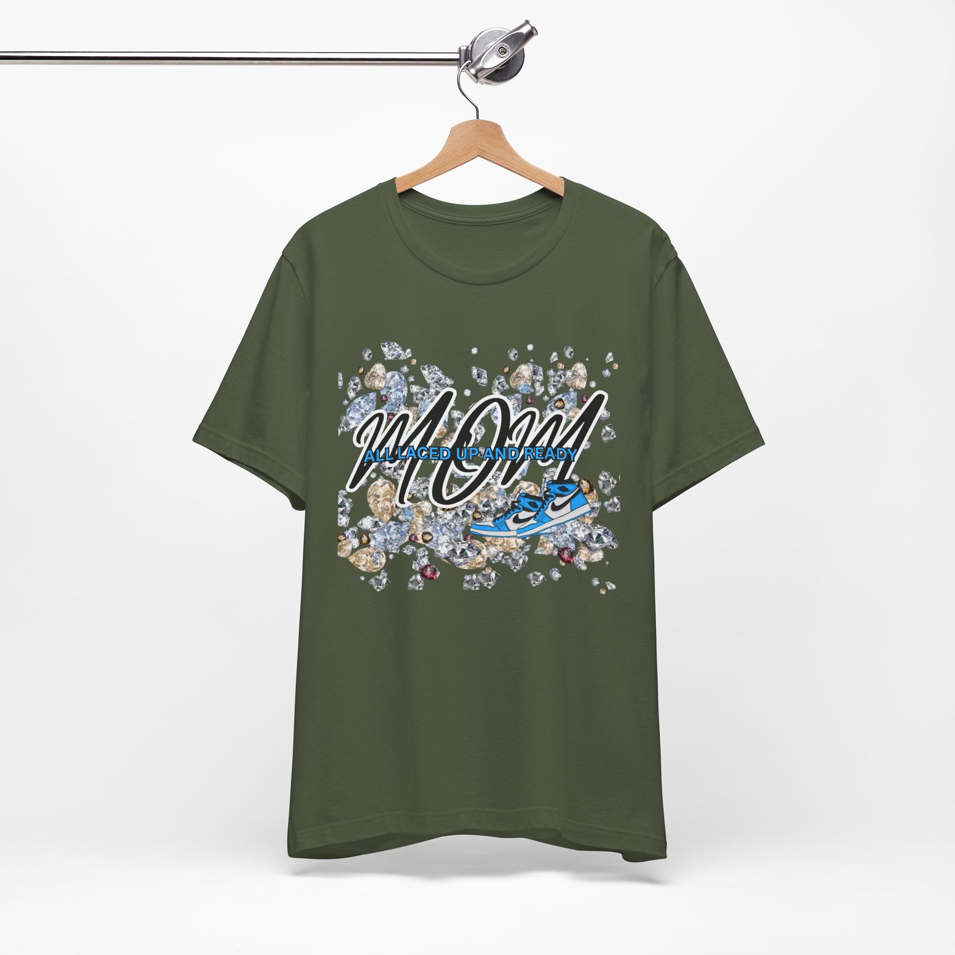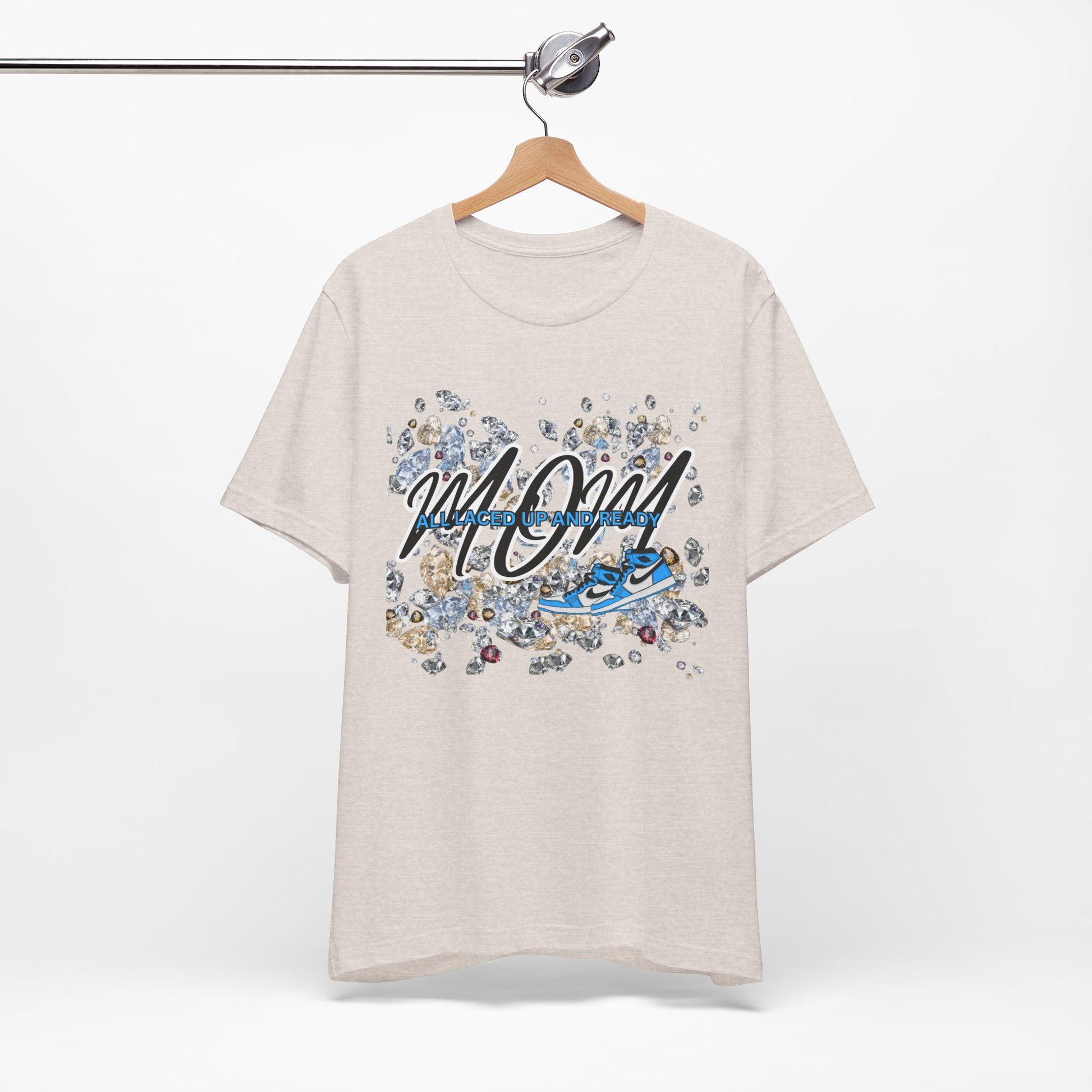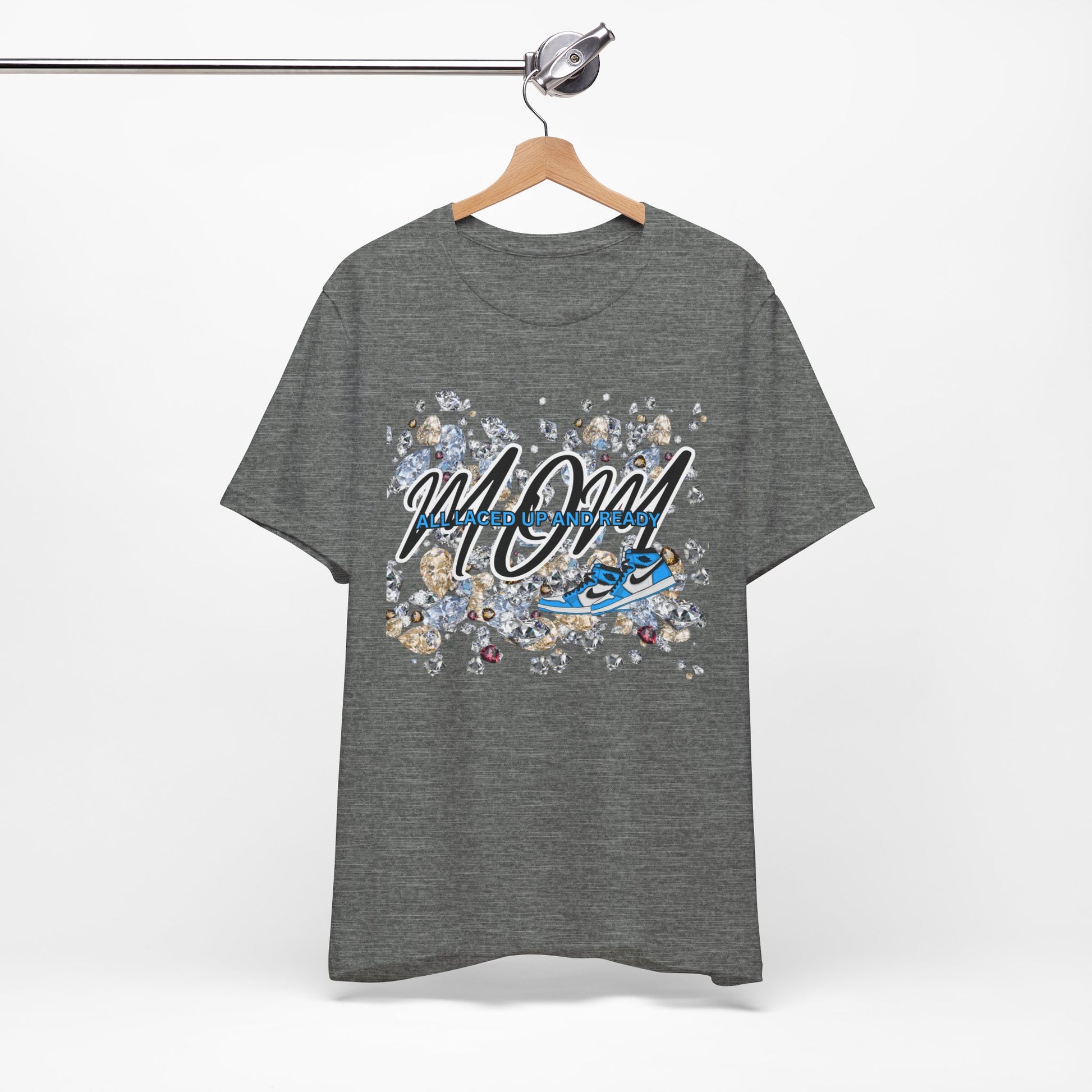 A stylish and comfortable T-Shirt featuring the text 'MOM, all laced up and ready to go'. This tee is perfect for mothers who are always on the move and ready for anything. Ideal for Mother's Day, birthdays, or any occasion to celebrate a special mom in your life.