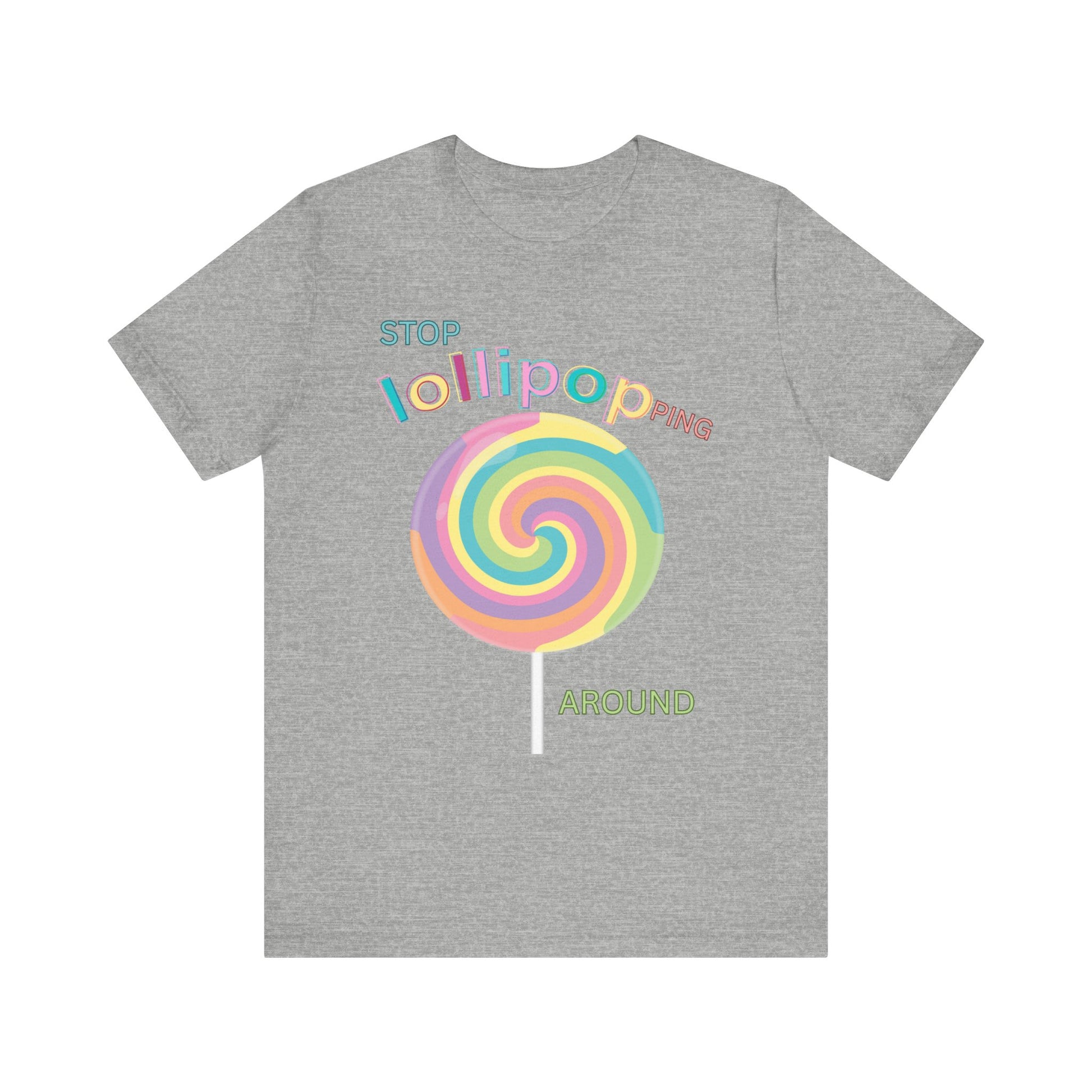 A fun and quirky T-Shirt with the bold message 'STOP LOLLIPOPPING AROUND'. This tee exudes a playful and rebellious vibe, perfect for those who enjoy making a statement with their clothing. Ideal for casual wear, this T-Shirt is relevant for holidays, celebrations, and occasions where a touch of humor is appreciated.